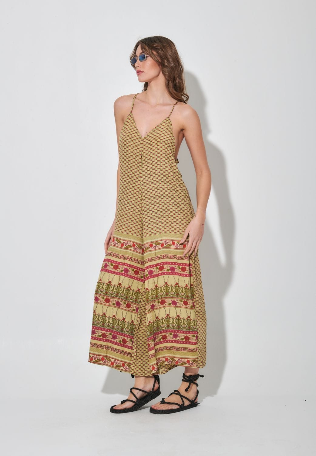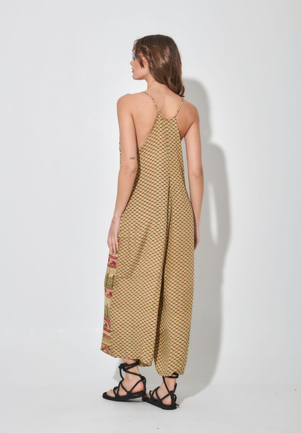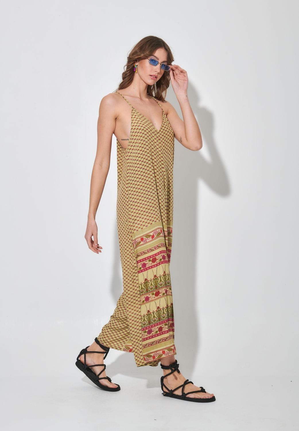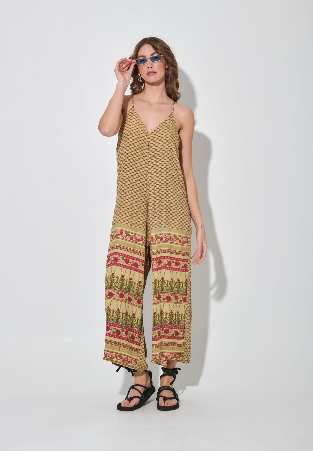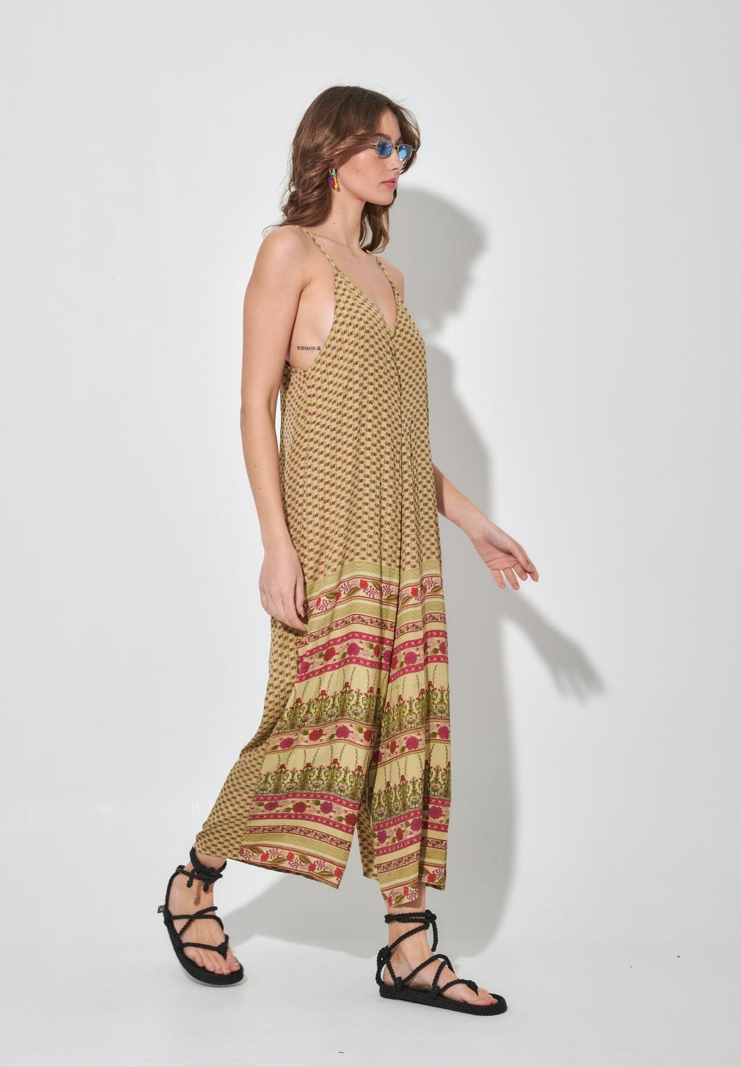 this stylish bohemian-print jumpsuit features a V-neckline, thin straps, and wide-leg trousers. The garment is characterized by its intricate yellow and green geometric patterns on the bodice, transitioning into a vibrant floral-inspired border at the hem.