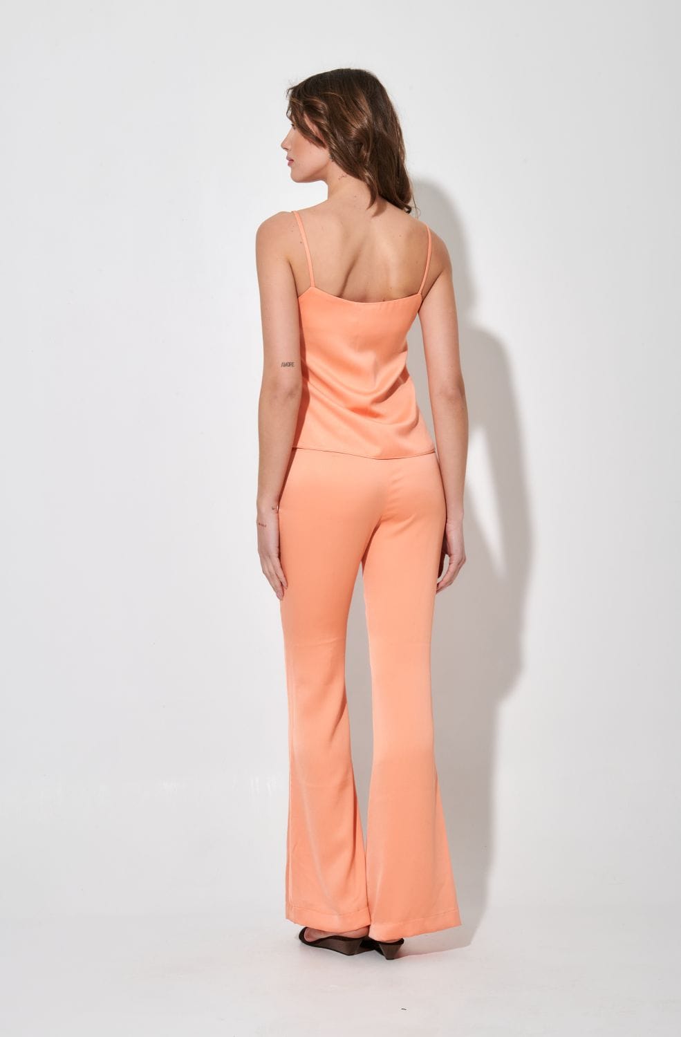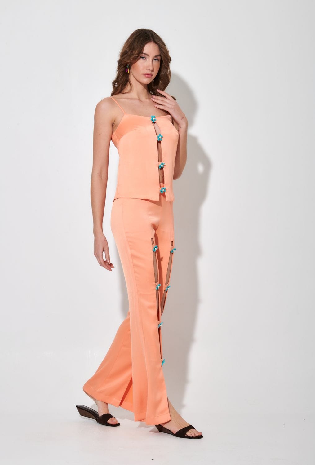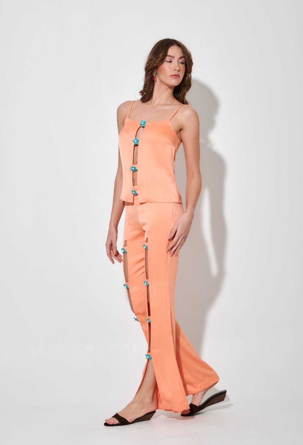 These orange, high-waisted pants feature a flared “bell-bottom” silhouette and are crafted from 100% recycled silk. Their most distinctive detail is the vertical front openings on each leg, which are held together by blue decorative daisy buttons.