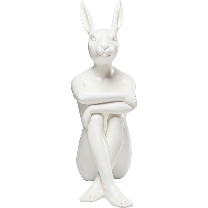 Design: A white, matte-finished rabbit with a human-like body in a seated, contemplative pose. It is also produced in other colors, such as black.